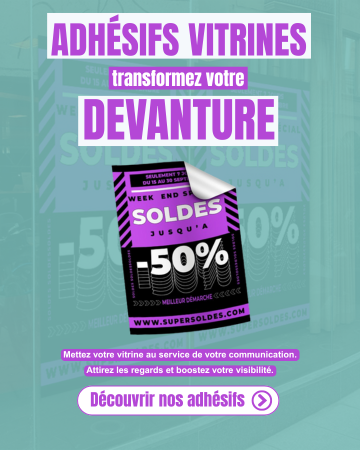 Que ce soit pour dynamiser votre espace de vente, promouvoir une offre ou habiller vos vitrines à l’occasion d’un événement, nos adhésifs vitrines sont conçus pour s’adapter à toutes vos envies. Grâce à leur qualité d’impression et leur facilité d’application, vos surfaces vitrées deviennent de véritables supports de communication.