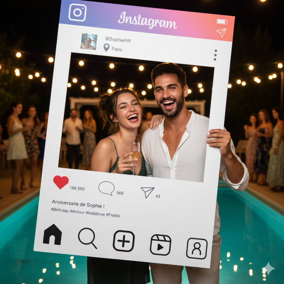 Né dans les mariages américains et popularisé notamment par les réseaux sociaux sur Instagram et TikTok, le cadre photobooth est devenu un incontournable des événements généralement festifs. Il s’agit d’un cadre géant en carton rigide, imprimé et découpé selon votre visuel, permettant aux invités de poser ensemble le temps d’une photo sérieuse ou plus fun pour les plus fous. C’est donc un accessoire à la fois ludique et décoratif qui transforme l’espace dans lequel vous vous situez en véritable interaction entre les personnes, laissant des souvenirs pour toujours.