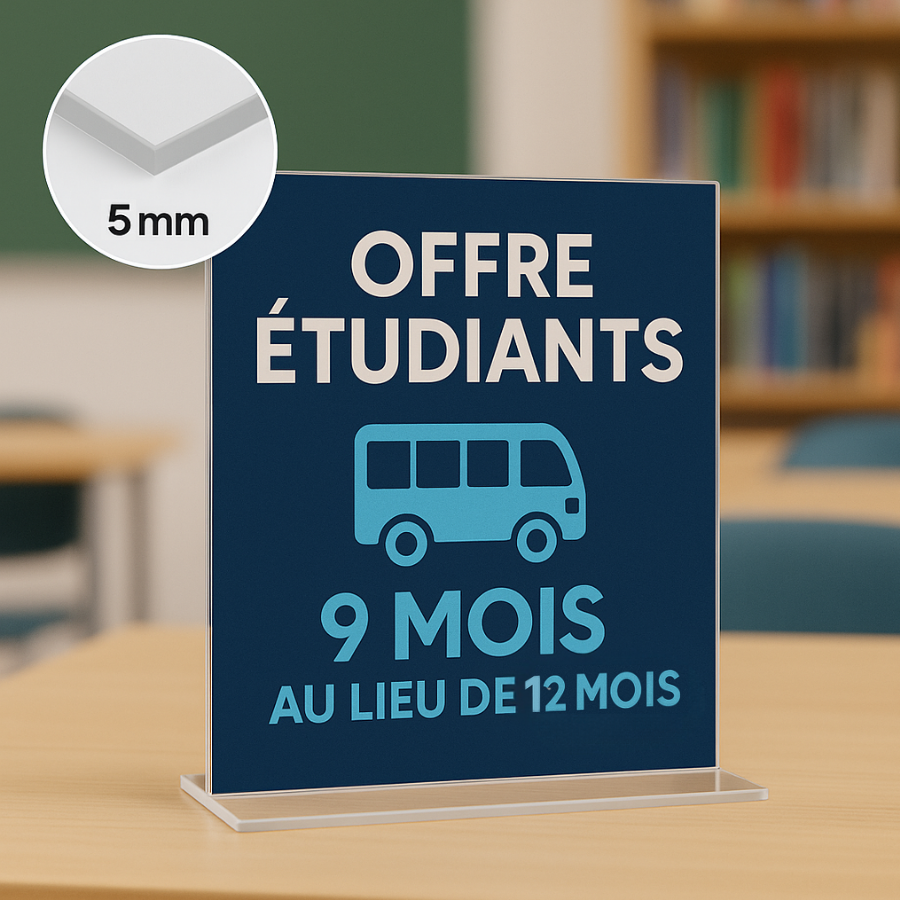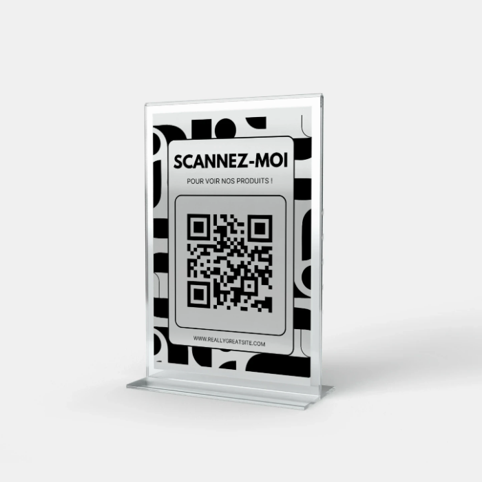 Le chevalet plexiglas est un support de communication rigide, autoportant et transparent. Il est conçu pour afficher un message à la hauteur des yeux ou plus bas. Fabriqué à partir de plexiglas 5mm d’épaisseur, il allie élégance, sobriété et durabilité et s’intègre facilement dans tous les environnements. En plus de son esthétisme, il permet aujourd’hui avec nos technologies d’intégrer des éléments digitaux comme un QR code, pour rediriger vers un menu, une fiche produit ou un formulaire de réservation. Cet outil est donc très tendance dans l’univers de la communication et peut aussi bien être utilisé dans les espaces de vente que dans les bureaux ou salons.
