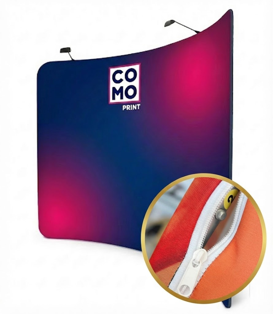 Que vous choisissiez un mur d’image droit ou courbé, ce modèle est très plébiscité des professionnels, car il comporte de nombreux avantages majeurs qui font qu’il est très utilisé. Il se monte tout d’abord très facilement et sans outils en quelques minutes (- de 5 min). Le tissu permet de ne pas laisser la lumière traverser le visuel ou d’avoir de mauvais reflets. Une fois monté, aucun raccord n’est visible pour que votre visuel ne soit en aucun cas interrompu par un zip par exemple. Un transport facilité, chez Comoprint pour tout achat d’un roll up, stand, mur d’image ou photocall bénéficiez d’un sac de transport idéal pour se déplacer.