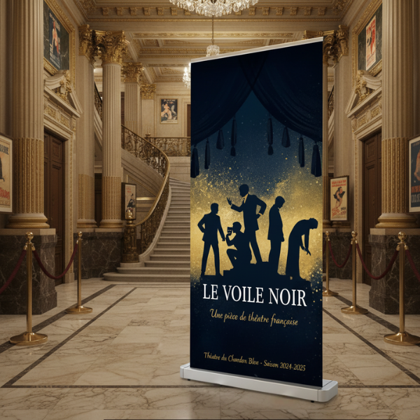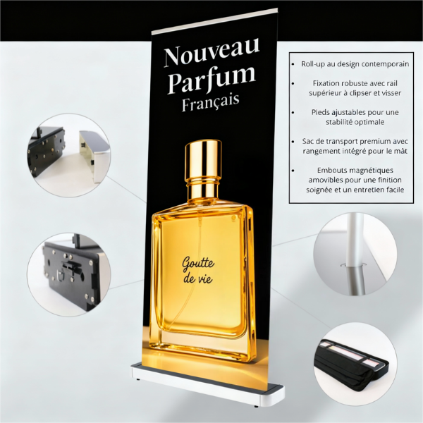 Comme le roll up gamme luxe, ce roll up de qualité est adapté pour une présentation liée à un environnement haut de gamme, luxueux.