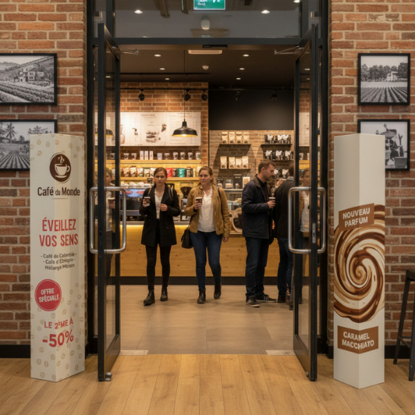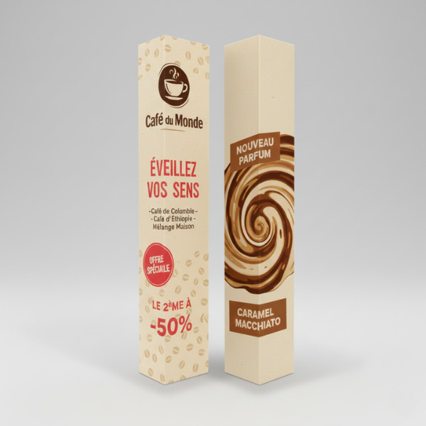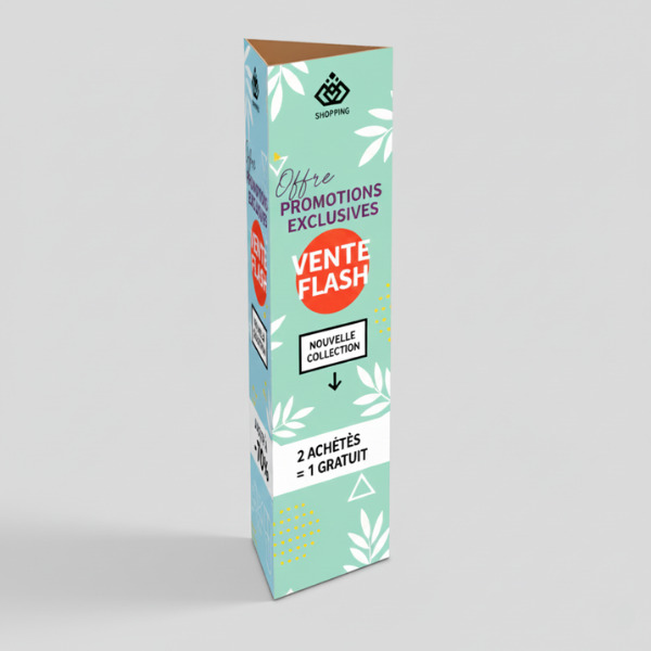 Ce support PLV grand format combine impact visuel, stabilité et facilité d'installation. Disponible en carton micro-cannelure ou polypropylène alvéolaire, il garantit un rendu professionnel adapté à tous vos besoins.