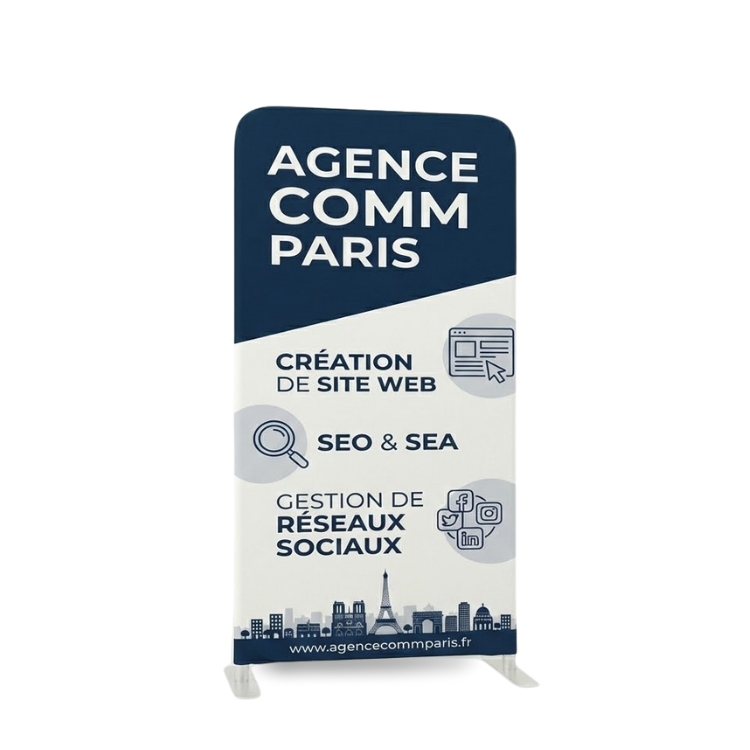 Le prix d’un totem textile chez Comoprint est à partir de 159,99€ mais figurez-vous qu’il représente un réel investissement long terme. Le tarif dépend souvent de son format puis de la livraison. Son avantage est qu’il est réutilisable très longtemps et que vous pouvez recommander seulement le visuel s’il n’est plus à jour ou bien la structure si elle est endommagée.