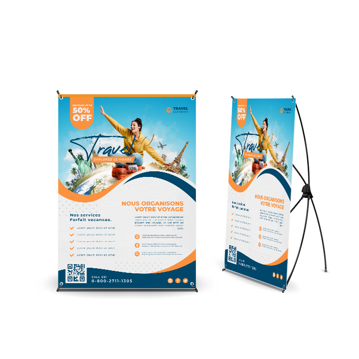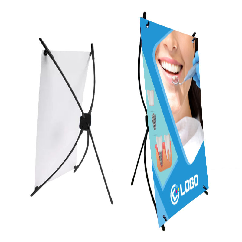 Ce totem en X est composé d’un visuel rectangulaire en PVC attachée à une structure métallique grâce à la présence de 4 œillets situés à chaque extrémité. Sa forme en croix lui procure une haute stabilité en trois points d’appui sur votre comptoir. Selon vos besoins, Comoprint vous laisse le choix entre trois supports d’impression différents : Bâche à dos noir 375g (occultant), Bâche Pro 450g M1, Textile enduit 275g Anti-reflet sans PVC M1, Film dos gris 330g anti-curling, Textile enduit mat dos gris opaque 275g Anti-reflet.